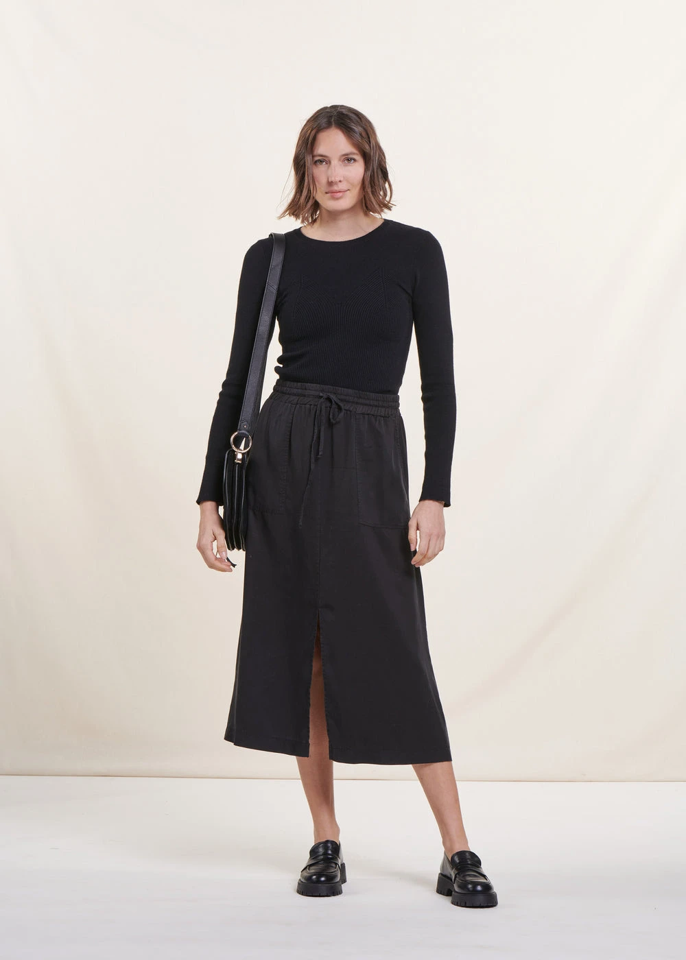 – Jupe mi-longue dans un tissu fluide et léger en Lyocell