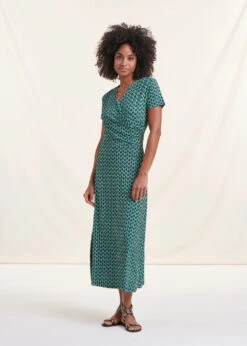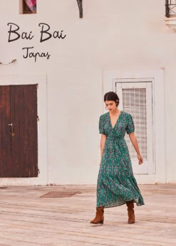 Robe Longue Cintrée Bohème Verte Manches Courtes Imprimé Ethnique