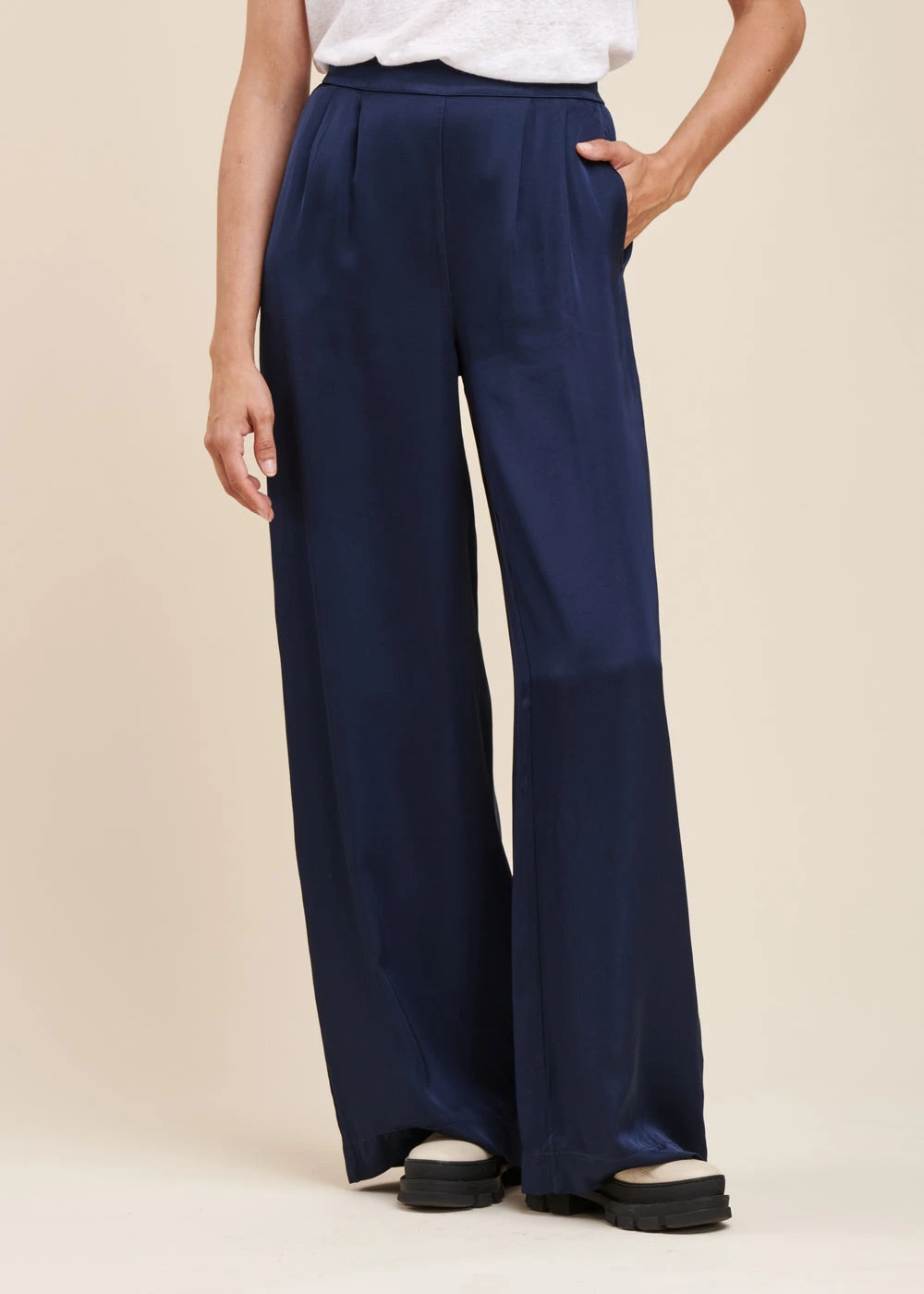 Pantalon Bleu Foncé Ample Fluide En Satin