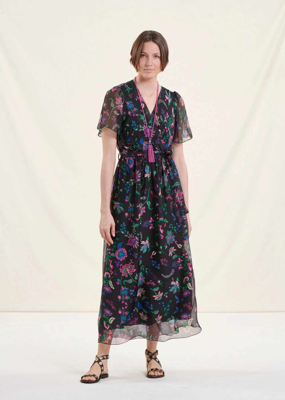 Robe Longue Bohême Noire En Voile Fleuri Manches Courtes