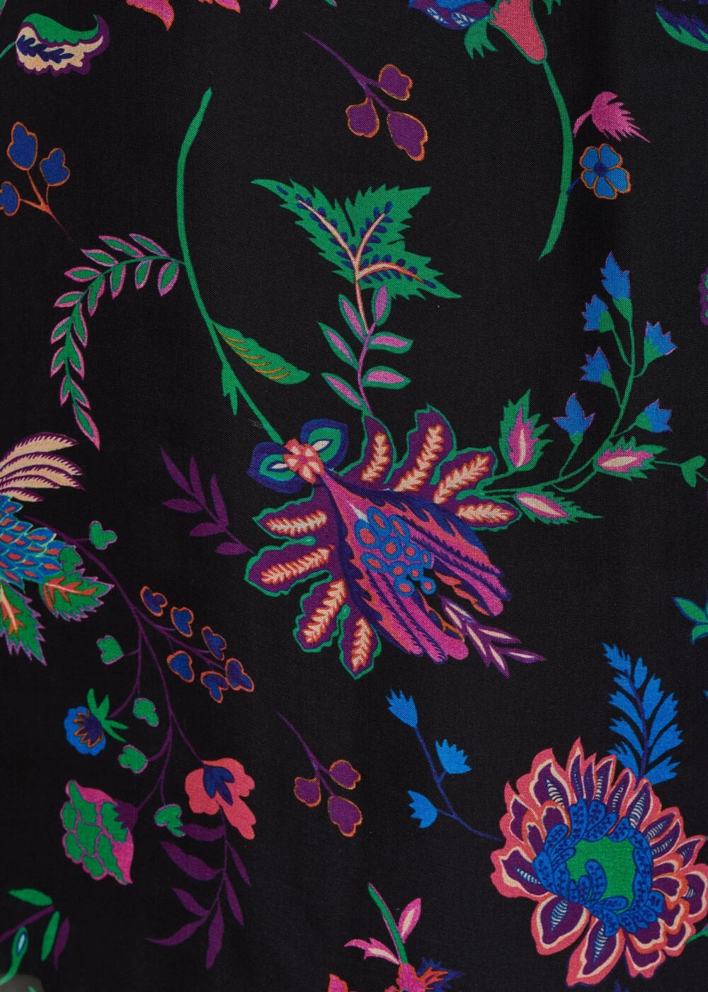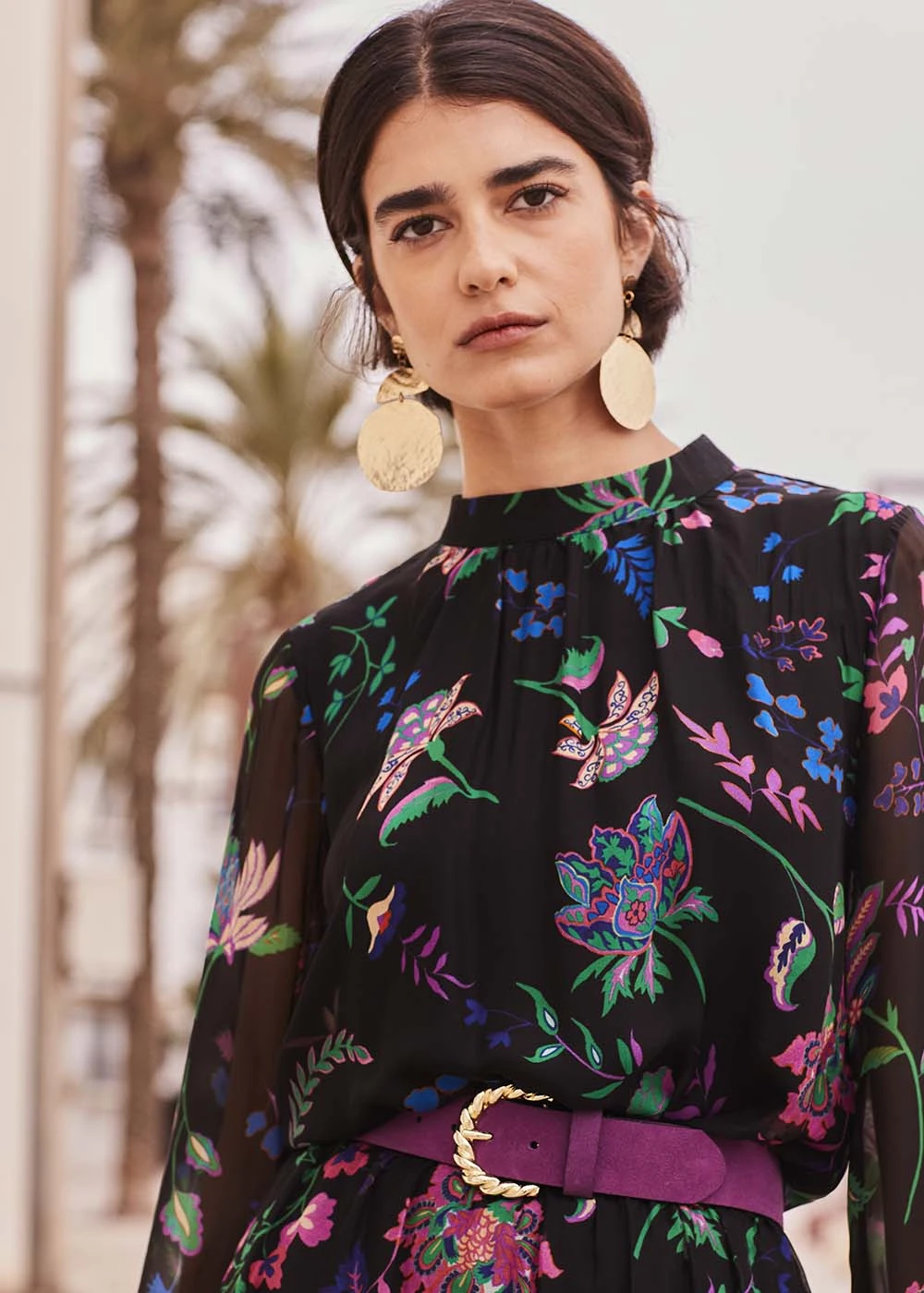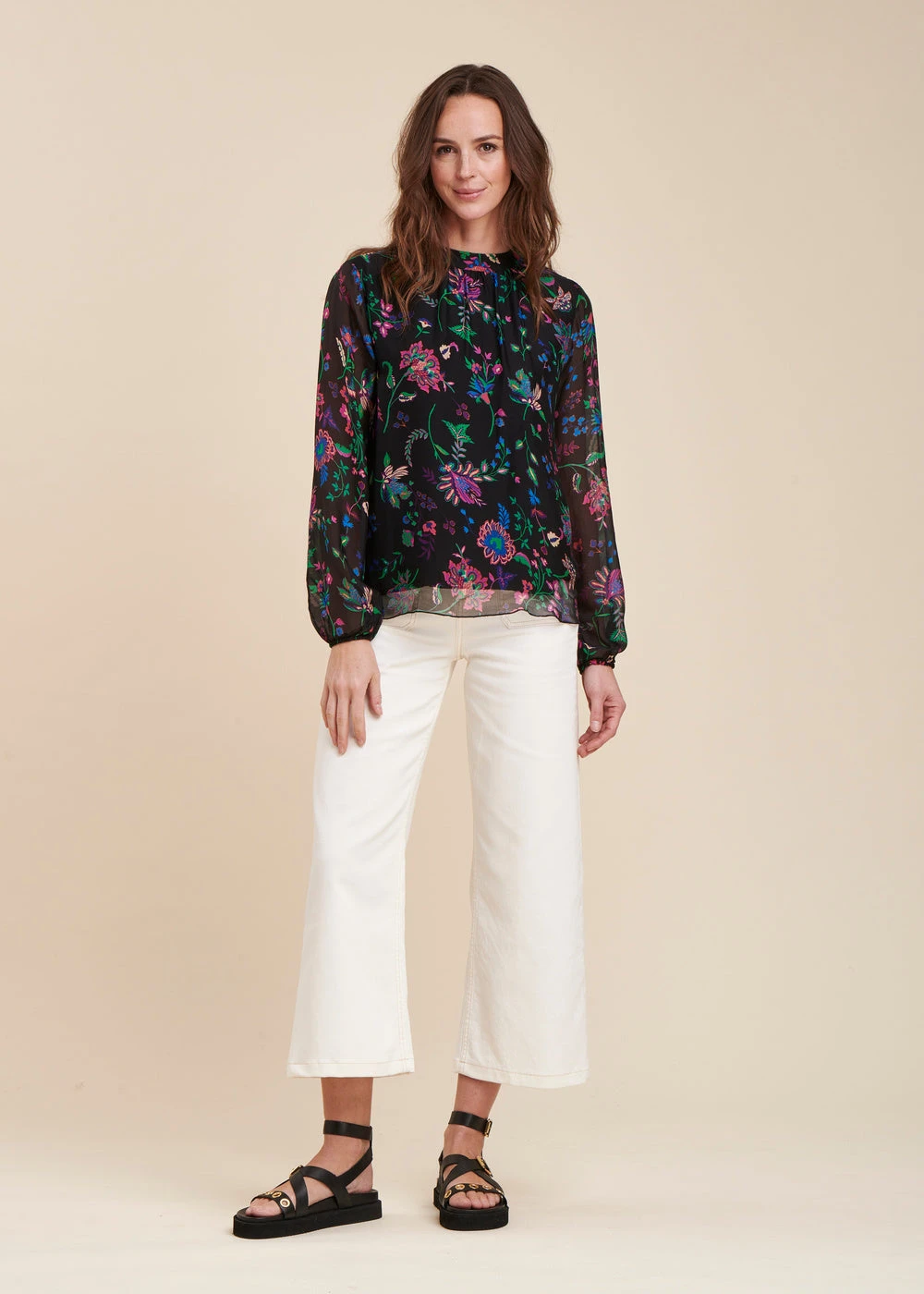 Top Noir Fluide Manches Longues En Voile Fleuri